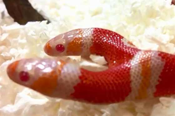 Kígyónk esetében a testhez két fej tartozik. A természetben az ilyen egyedek hamar elpusztulnak, de ennek a kígyónak szerencséje van, mert az emberi gondoskodás megmenti életét.