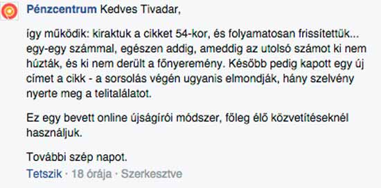 Majd így folytatják: Állítólag a pénzcentrum.hu húsz, azaz 20 perccel hamarább megírta az ötös lottó nyerőszámait, minthogy azokat valójában kihúzták volna. Véletlen?