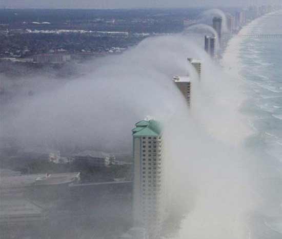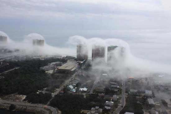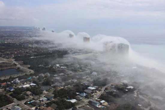 Biztosan leesett az álla az amerikai Panama City lakóinak, amikor meglátták a hatalmas toronyházak fölött “átcsapó” felhőket. A rendkívül ritka és látványos időjárási jelenséget többen is megörökítették a floridai tengerparti városban. A felhőcunamiként emlegetett jelenség a tengerpartokon, a szárazföldek és a tengerek találkozásánál alakul ki. Az óceán felől a szárazföld fölé beáramló felhőkből a tengeri szökőárhoz hasonló hullámok alakultak ki. A Panama City partján kialakult felhő hullámok eltakarták a parton sorakozó sokemeletes épületeket, amik szinte eltűntek a felhők alatt.