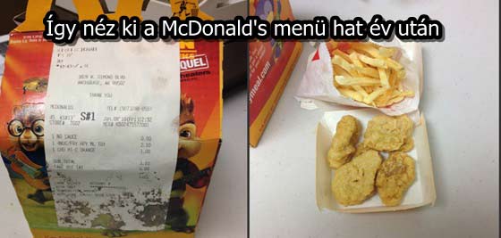 A szakember arra szerette volna felhívni a figyelmet, hogy a gyorskajákban igen bizarr összetevők lehetnek, ha egyszer hat év után sem rohadtak el. Hasábburgonya és csirke nuggets látható a képen, és szerintünk, ha nem mondjuk, hogy a menü hat éves, akkor el sem hinné senki.