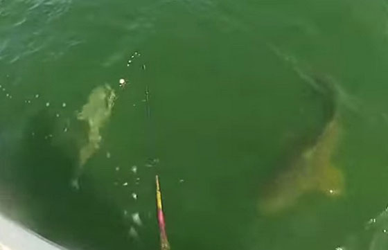Floridában, a Bonita Springs partjánál történt az eset. Egy hatalmas sügér rabolja el a horogra akadt nem kis méretű cápát.