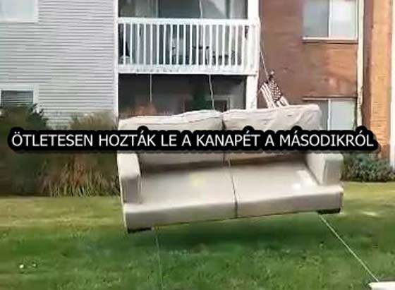 Erre remek példa ez a videó is ahol egy kanapét a másodikról zsinórokra kötve eresztettek le a földszintre. Az ötlet egy kicsit fura, de sikerült nekik és videóra is vették így most mi is megnézhetjük, és talán egy-két nézőnek még pont jól is jöhet ha esetleg költözés előtt áll és nem tudja hogyan vigye le a kanapét.