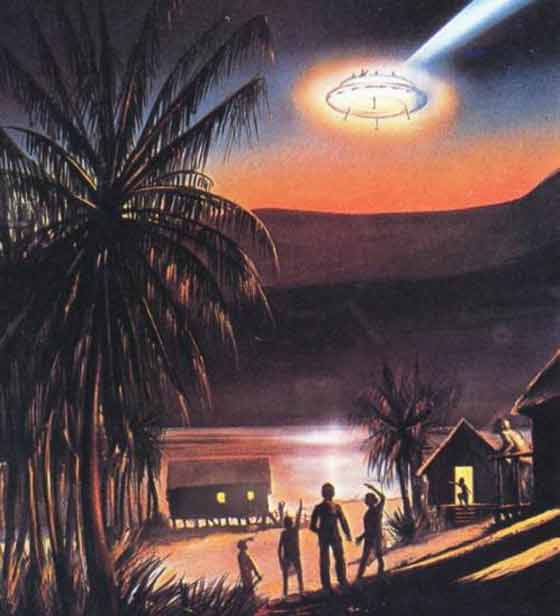Most már mindketten két kézzel integettünk, a járműről pedig mind a négy lény ugyanígy integetett vissza válaszul. Egytől egyig el voltunk ragadtatva. A fiúk (mármint a diákok) üdvrivalgásban törtek ki. Többen kiabáltak valamit a korong fedélzetén látott lényeknek, de nem hallottunk rá semmi választ. Az egyik diák előhozott egy erős zseblámpát és fénysugarát a korong felé irányította.